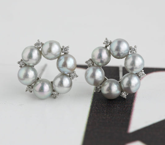 أقراط مسمارية من اللؤلؤ الأكوي الطبيعي الرمادي الفضي مقاس 7.5 مم مع ألماس، من الذهب الأبيض عيار 18 قيراط
