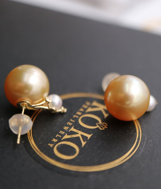 أقراط ذهبية من لؤلؤ جنوب البحر الذهبي وأكويا مع ألماس، ذهب أصفر عيار 18 قيراط
