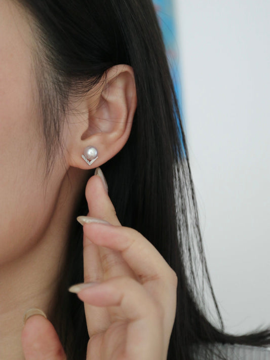أقراط مسمارية على شكل حرف V من اللؤلؤ الأكوي الطبيعي الرمادي الفضي مقاس 7 مم مع ماس، من الذهب الأبيض عيار 18 قيراط