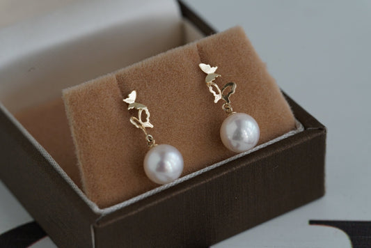 أقراط متدلية على شكل فراشة من لؤلؤ أكويا 6.5 مم، ذهب عيار 10 قيراط