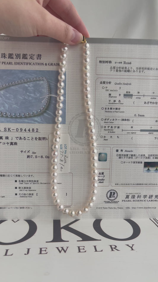 عقد خرز لؤلؤ أكويا عالي الجودة 7.5 مم مع شهادة أورورا روز من PSL
