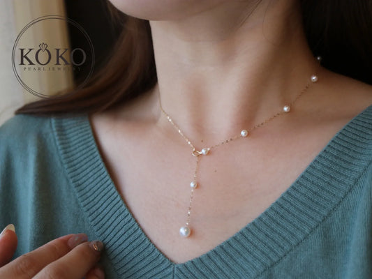 8mm Akoya Pearl Adjustable Y Shaped Pendant Necklace 18K Yellow Gold