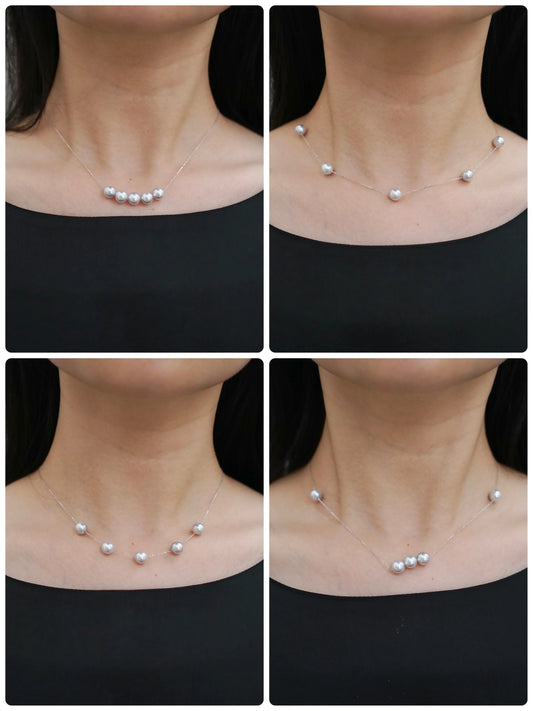 Movable 7.5mm Natural Silver Gray Akoya Pearl All in One Station Necklace 18K White Gold