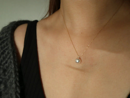 8mm Natural Silver Gray Akoya Pearl Diamond Pendant Necklace 18K White Gold