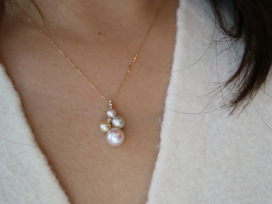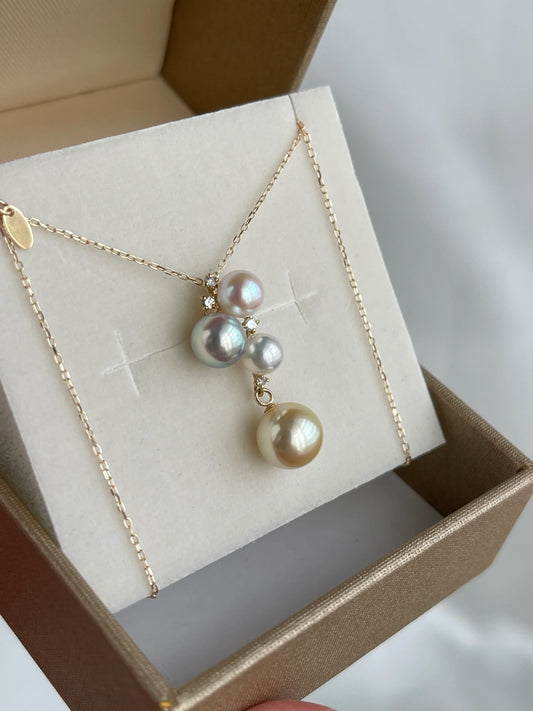 Mixed Color / Pinkish White 4-7.5mm Akoya Pearl Diamond Pendant Necklace 18K Yellow Gold