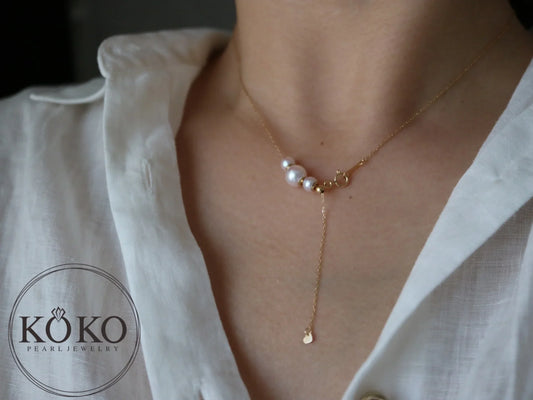 이동식 5+7mm 세 개의 아코야 진주 펜던트 목걸이 18K 옐로우 골드