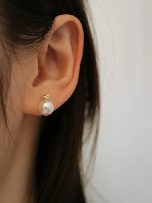 7.5mm 아코야 진주 다이아몬드 스터드 귀걸이 18K 옐로우 골드