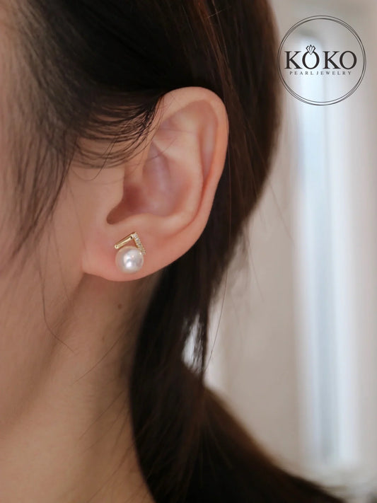 7mm 아코야 진주 V자형 다이아몬드 귀걸이 18K 옐로우 골드