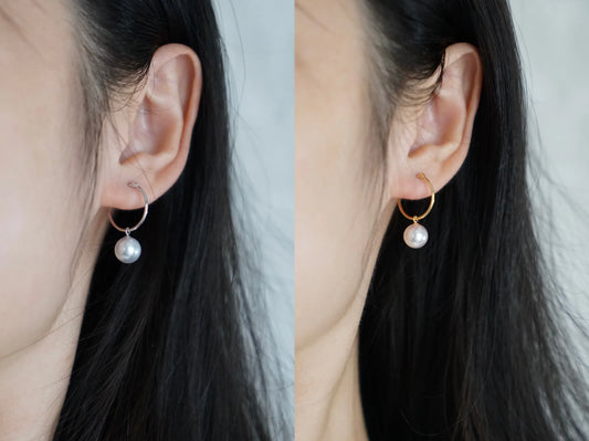 8mm 내추럴 실버 그레이 아코야 진주 드롭 후프 귀걸이 18K 화이트 골드