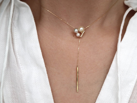 3-5.5mm 그라데이션 아코야 진주 다이아몬드 바 펜던트 | 18K 옐로우 골드