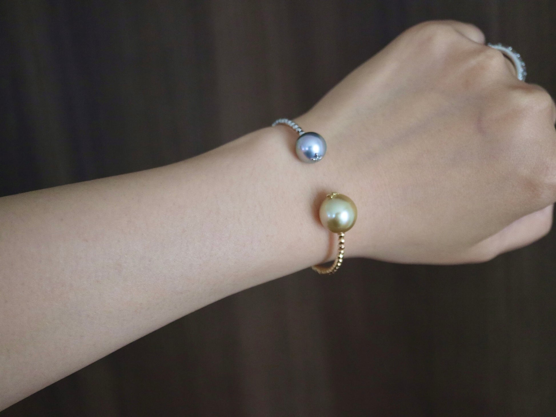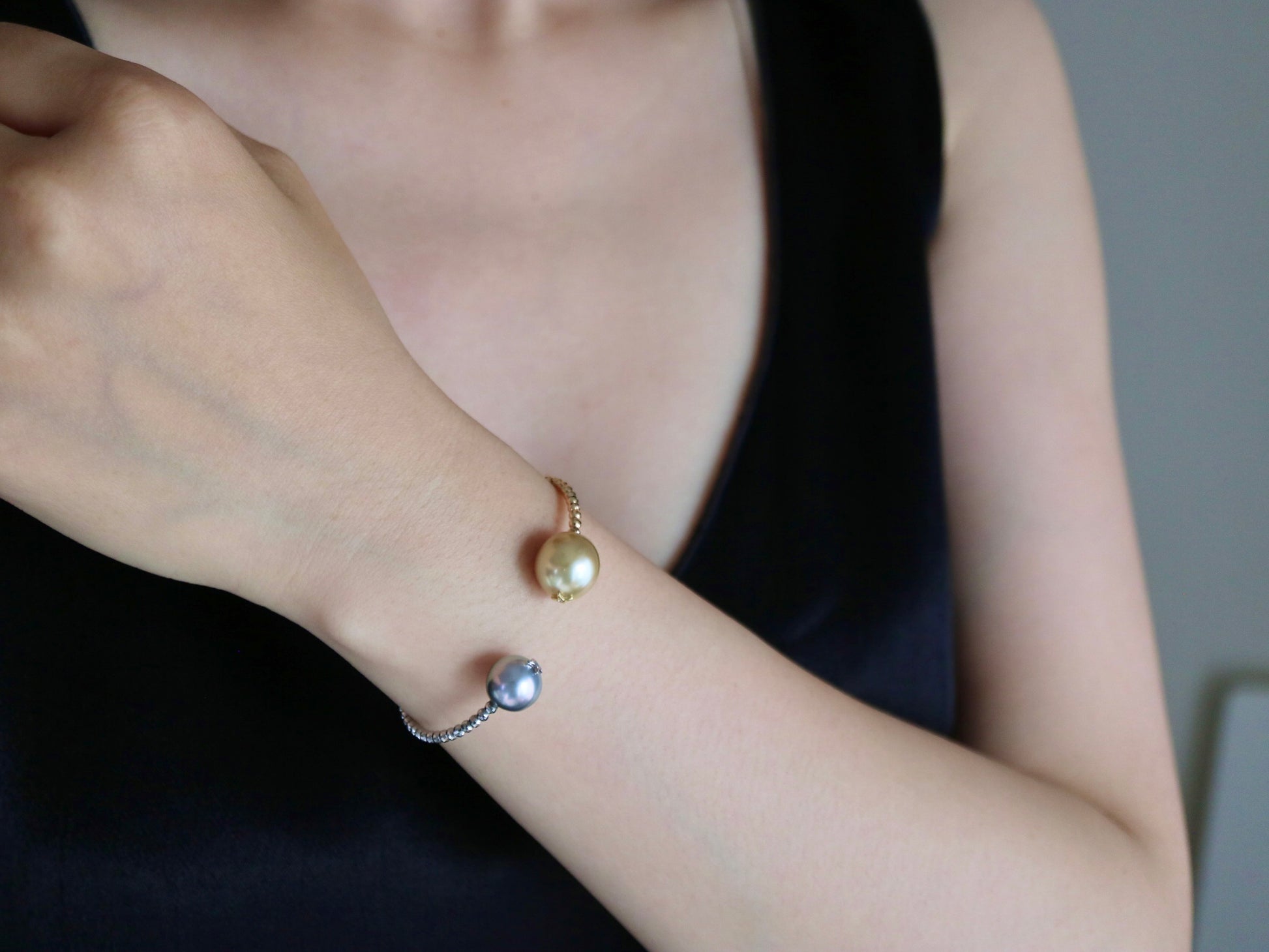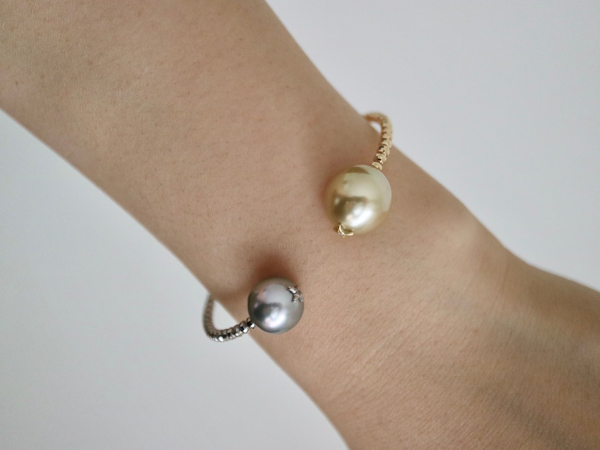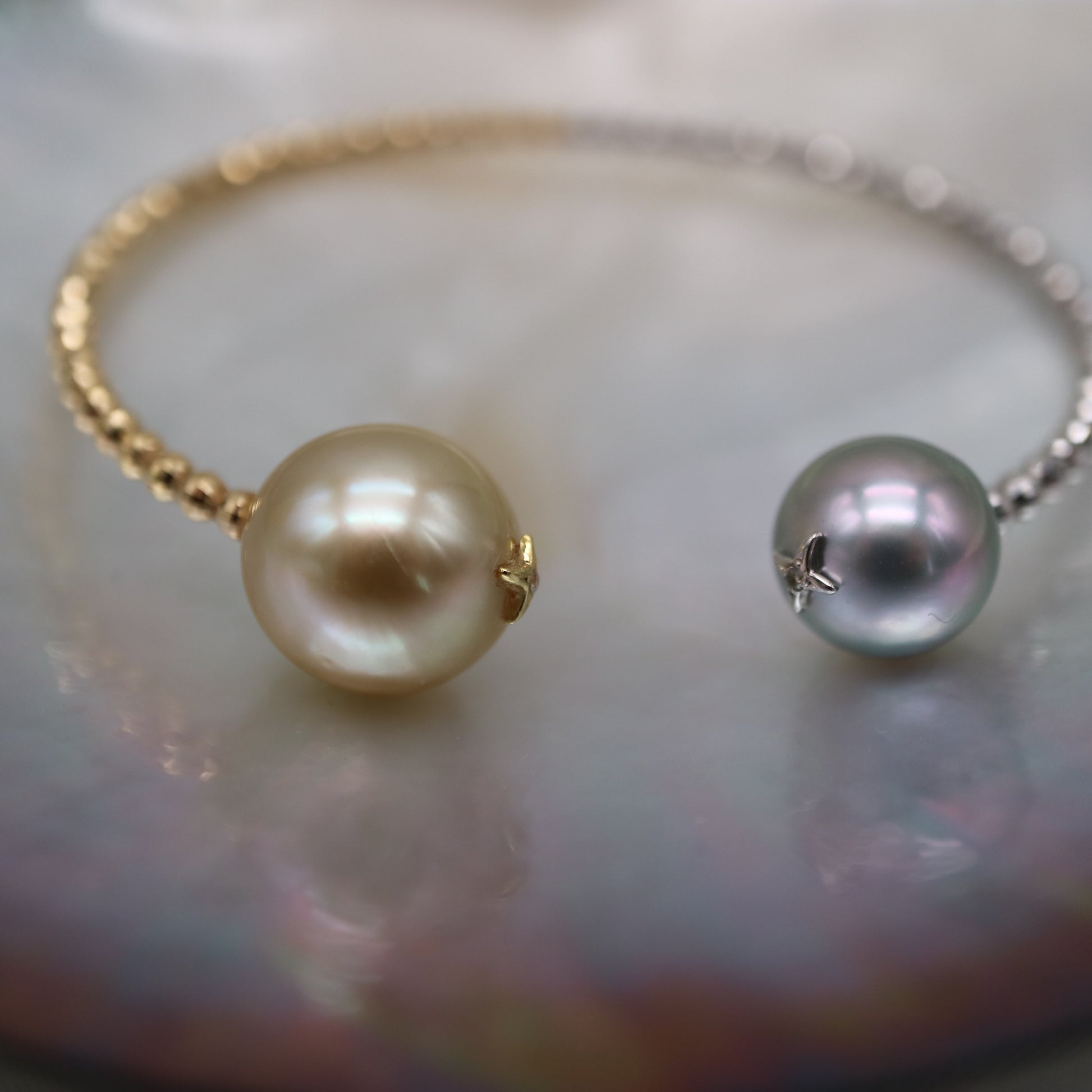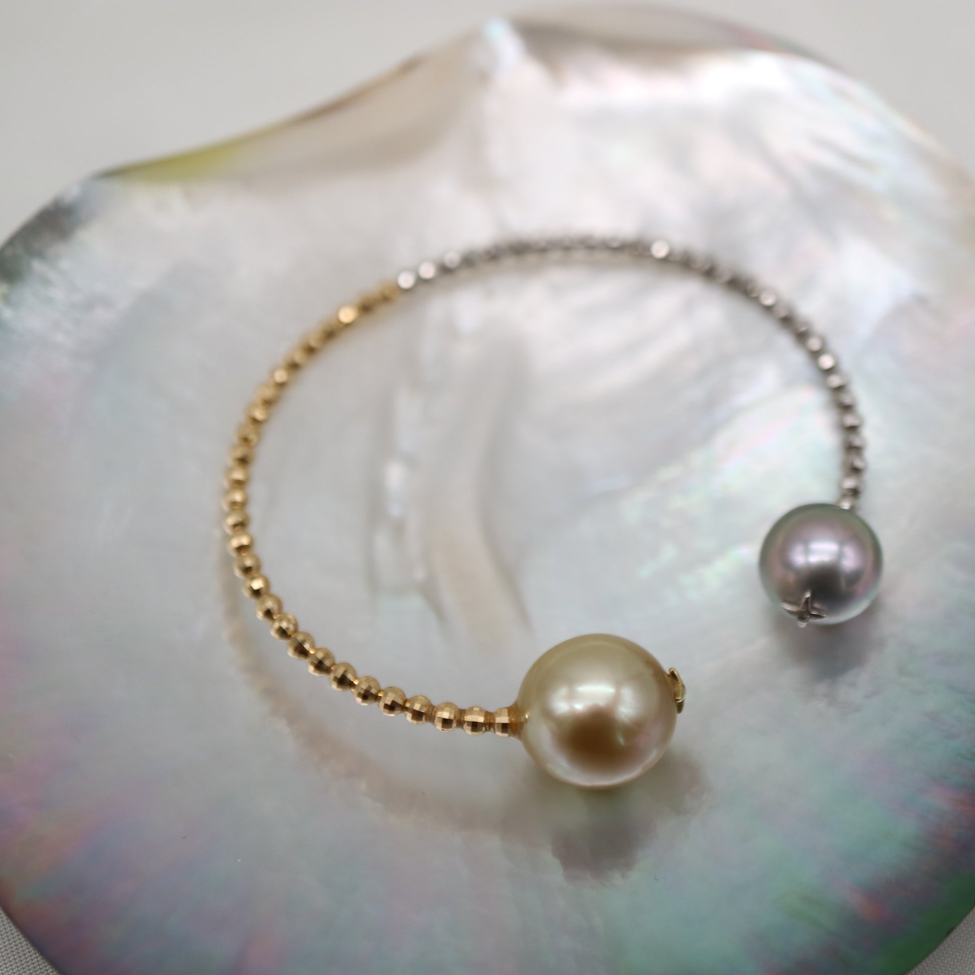 독특한 디자인 | 골든 사우스 씨 진주 & 타히티 진주 메모리 와이어 뱅글 18KYG & Pt900 비즈