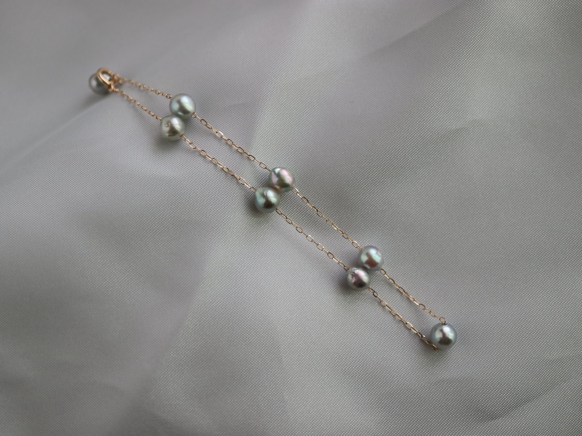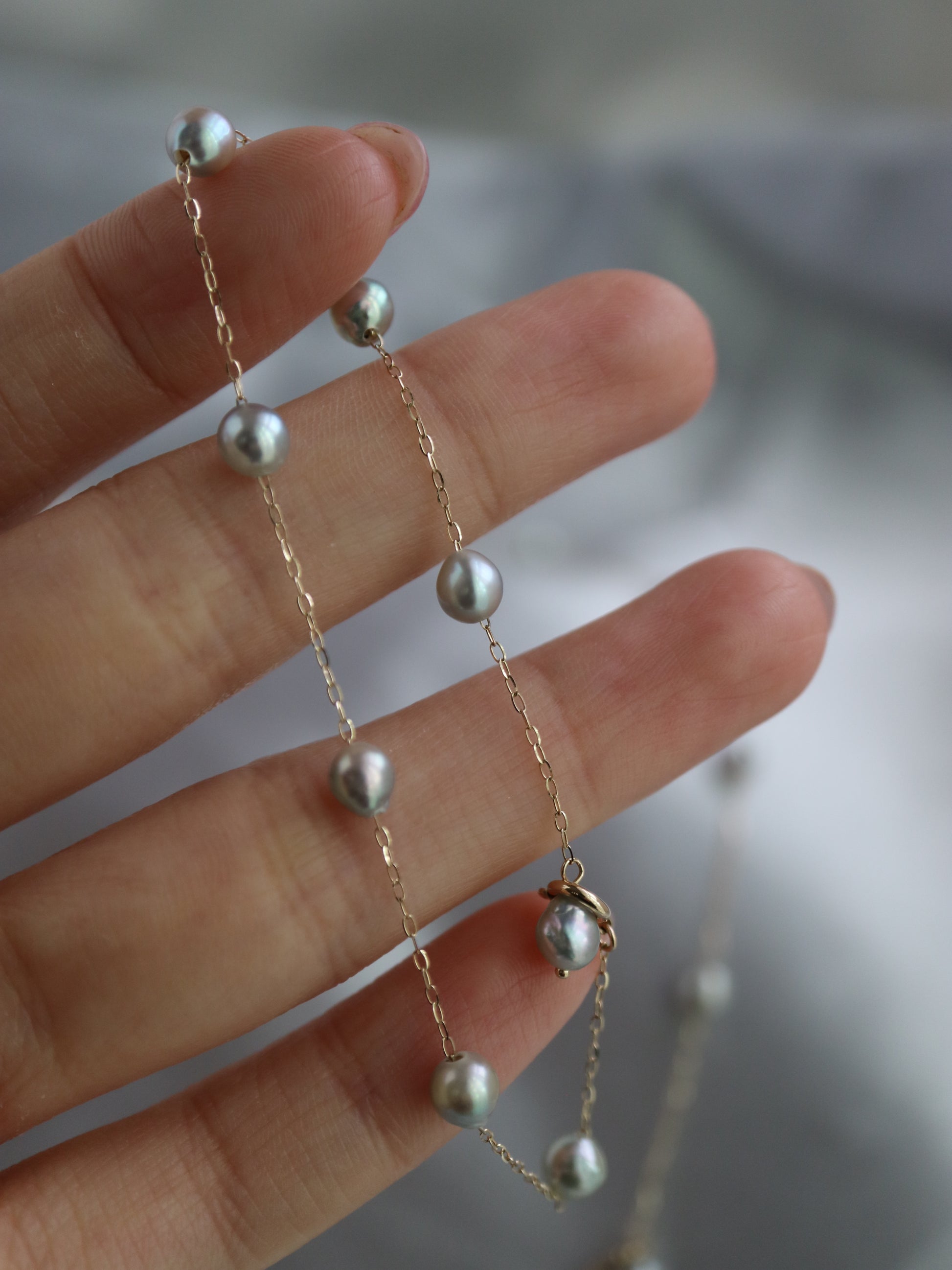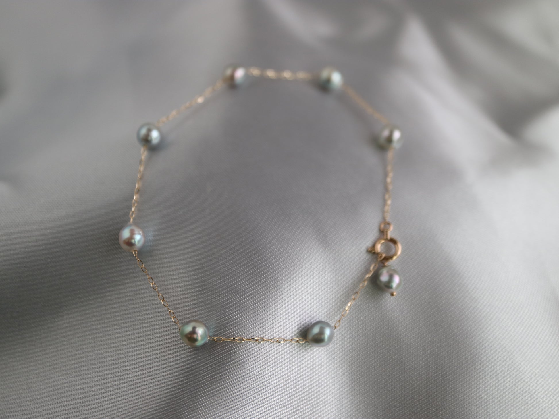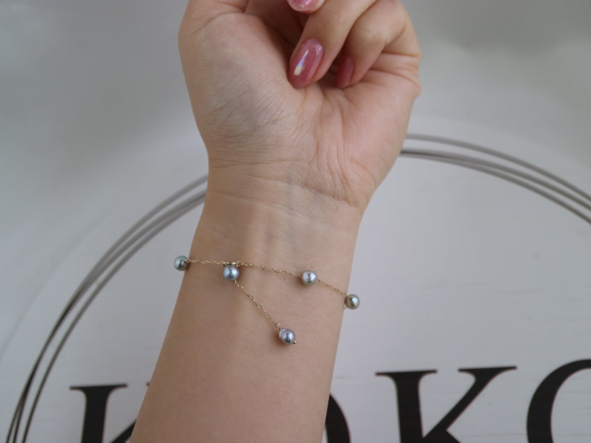 바로크형 천연 실버 블루 아코야 진주 스테이션 팔찌 K10YG