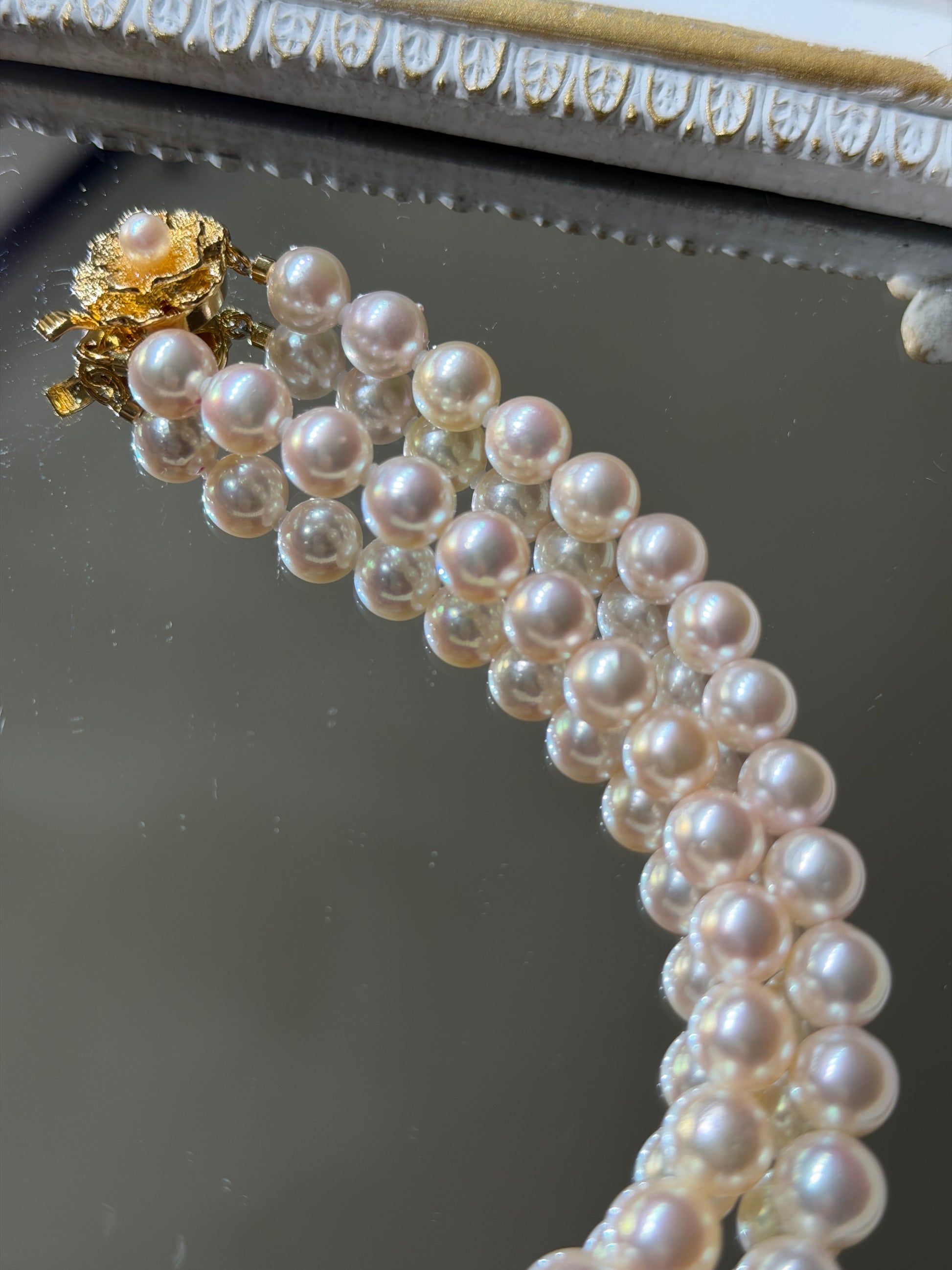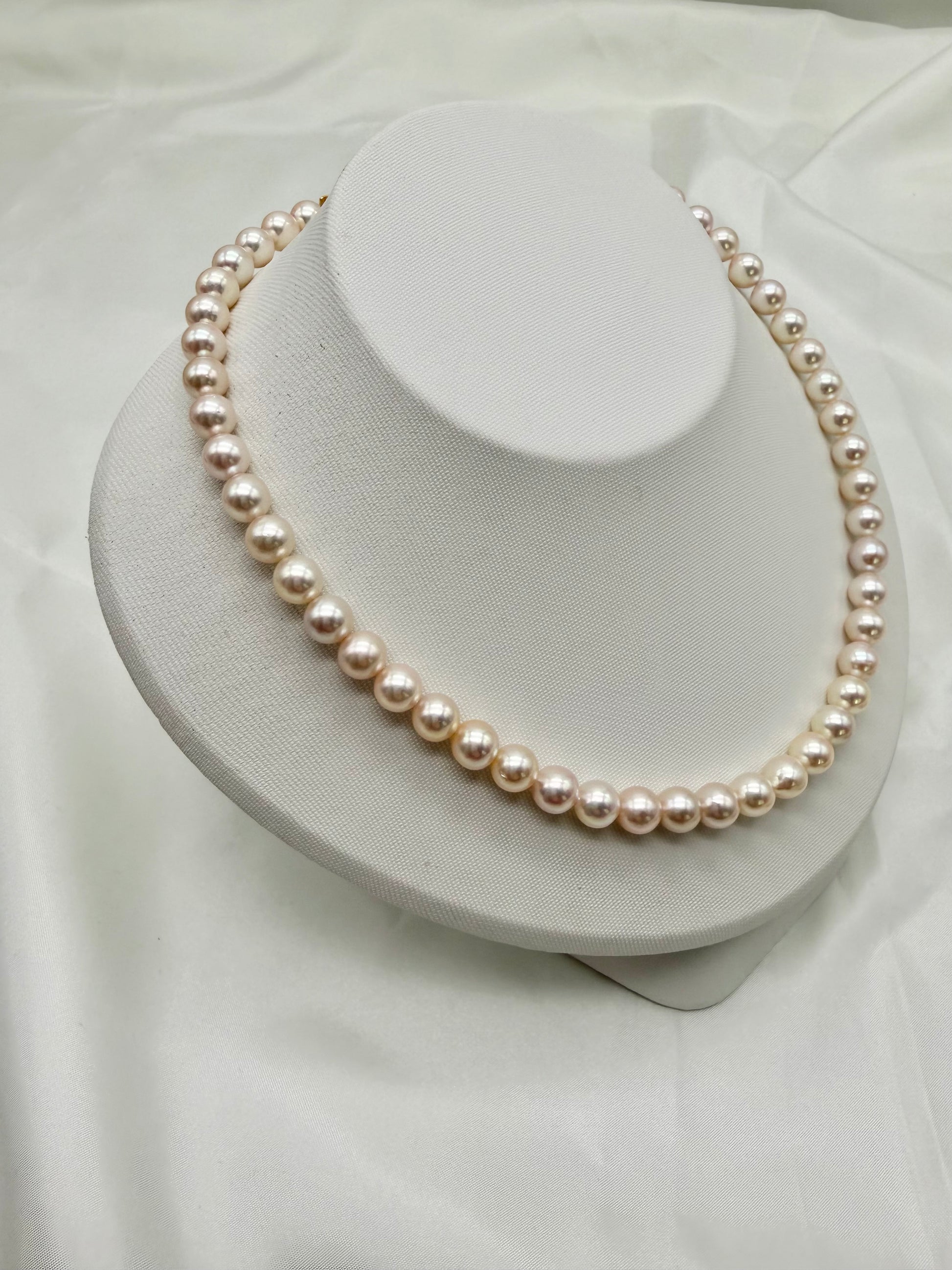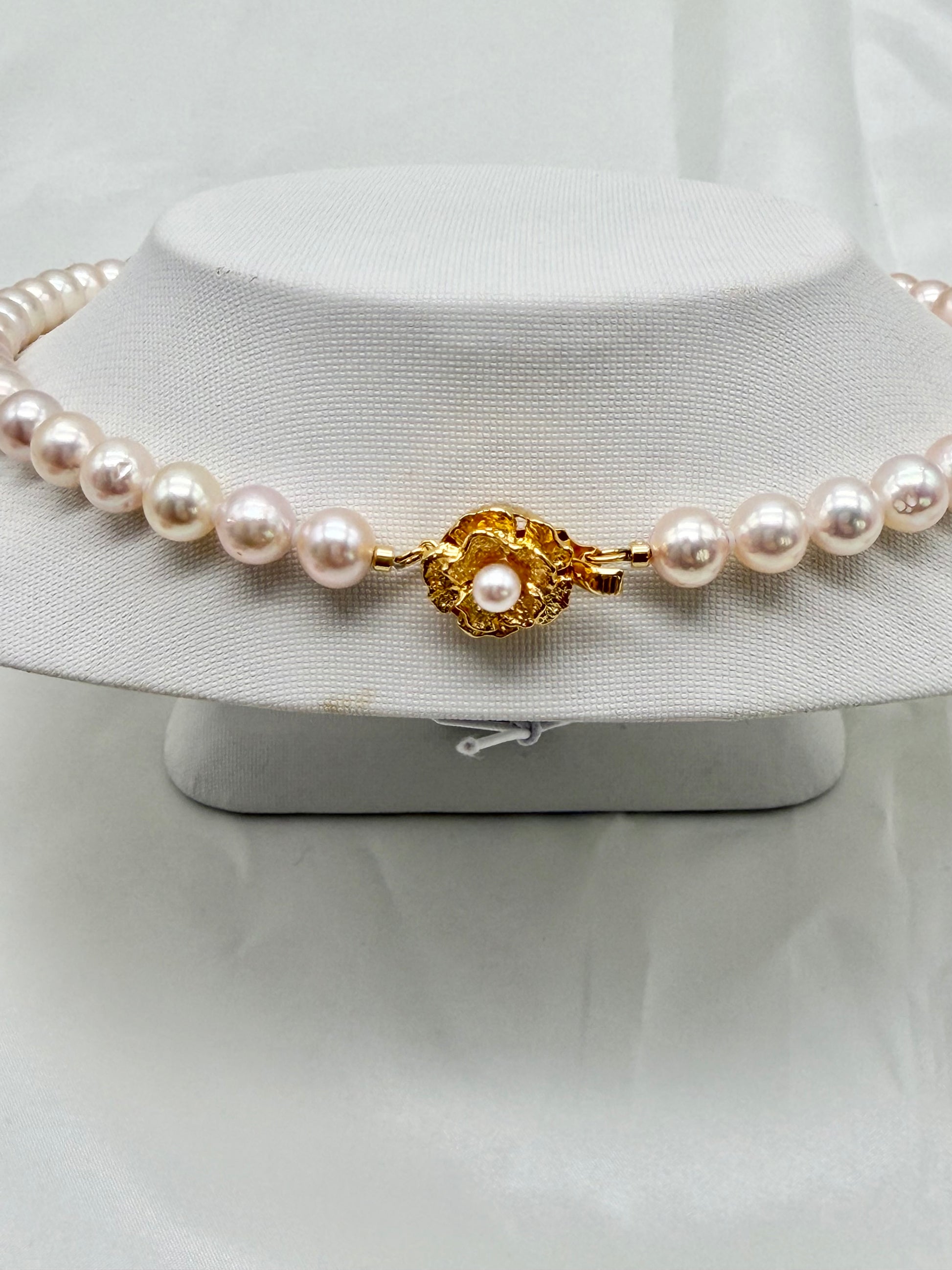 Only One Available | 희귀한 복숭아빛 핑크 7.5mm 아코야 진주 목걸이 골든 플라워 클라스프
