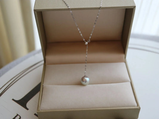 8mm Dây chuyền chữ Y ngọc trai Akoya màu xám bạc tự nhiên có thể điều chỉnh, vàng trắng 18K