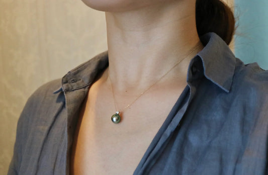 10mm Mặt Dây Chuyền Ngọc Trai Tahiti Đen Đính Kim Cương Vàng 18K
